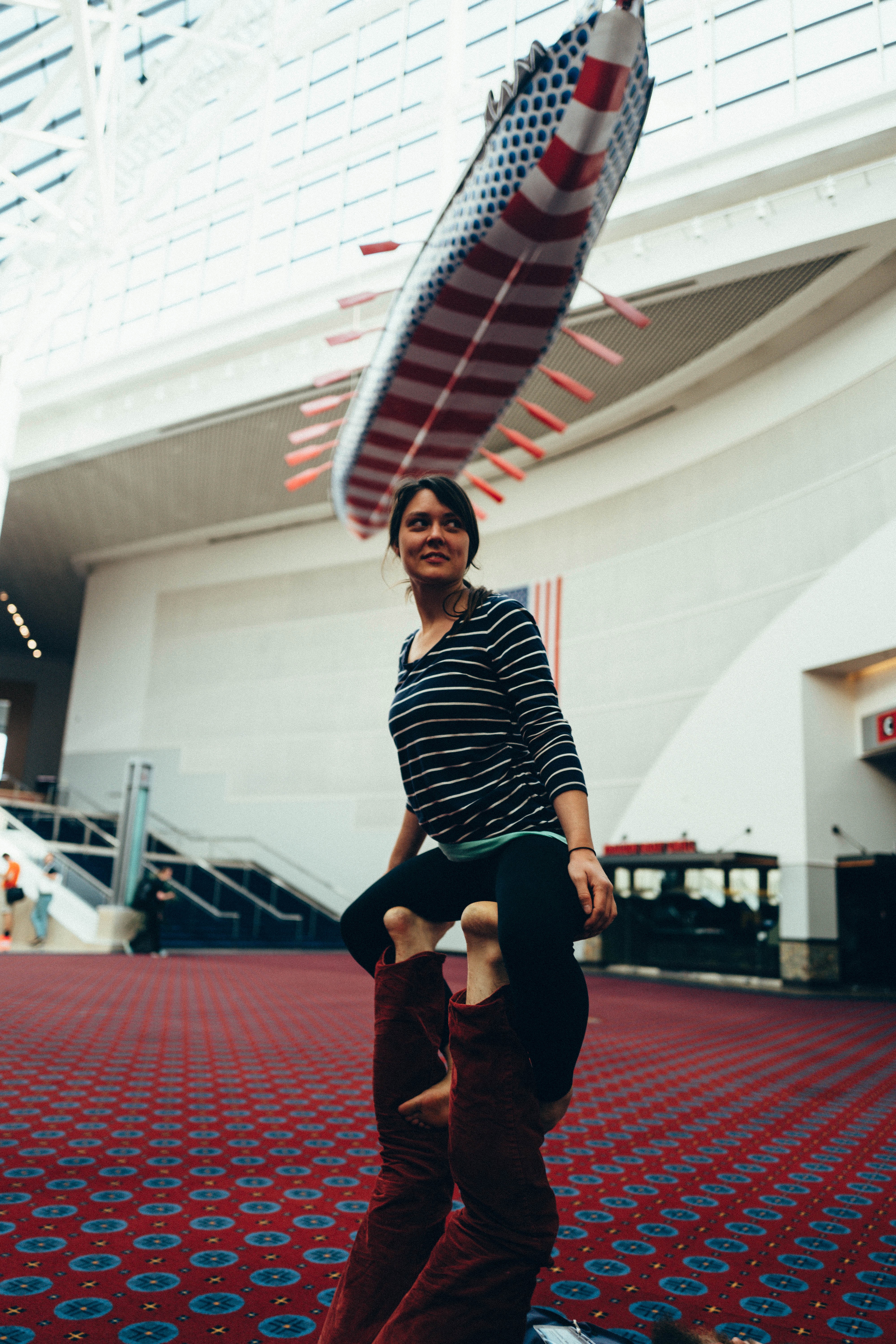 In this lively photograph, a woman confidently balances on top of someone's knees, set against the backdrop of a bright, airy interior. The whimsical overhead sculpture, resembling a ship, adds an element of fun and surrealism to the scene, while the vibrant red carpet creates a striking contrast with the otherwise neutral surroundings. The overall mood is playful and energetic, capturing a moment of joy and camaraderie.