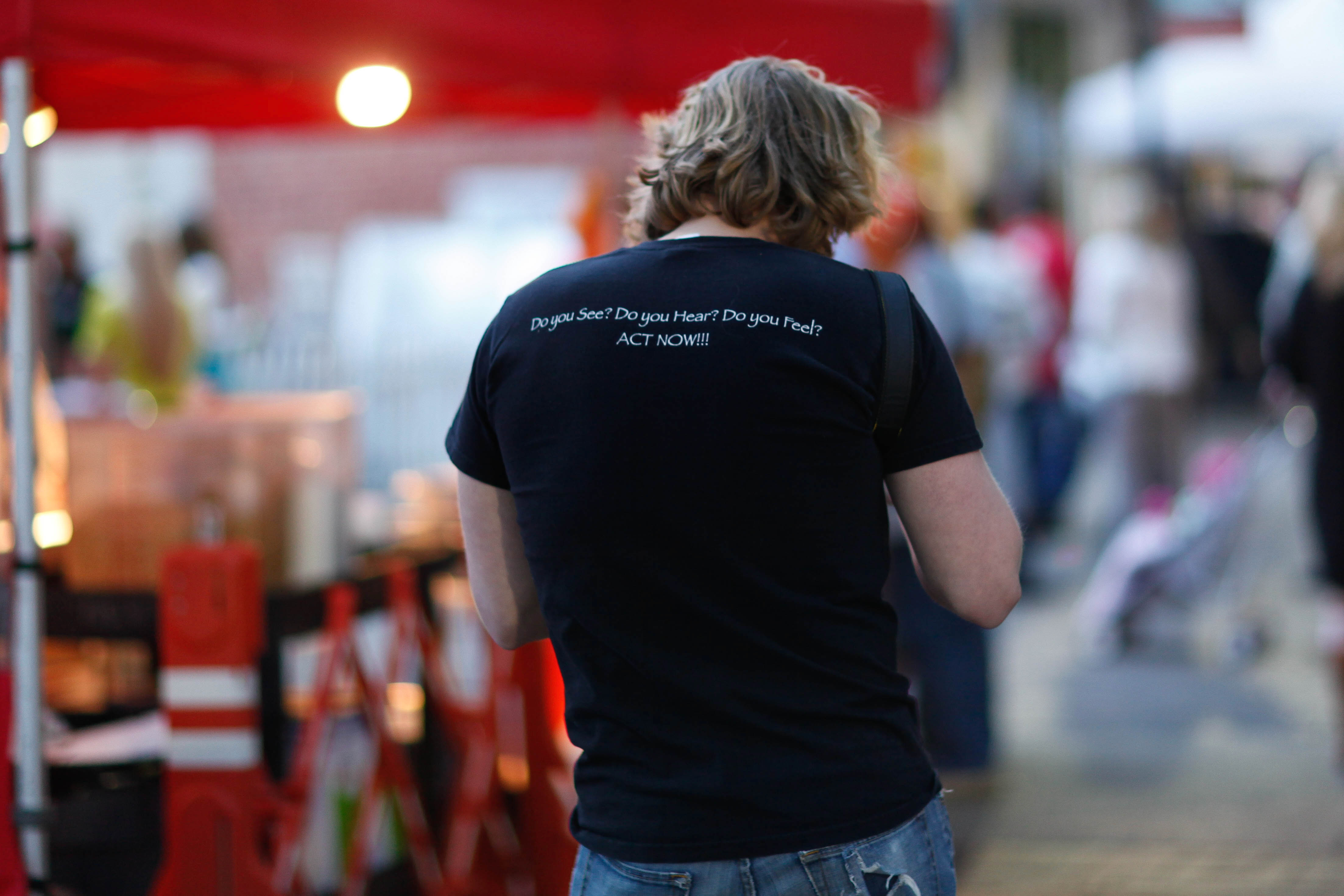 A person walks through a bustling outdoor market, their back turned to the viewer, revealing a black shirt emblazoned with a call to action. The soft, warm lighting from nearby stalls creates a vibrant yet contemplative atmosphere, highlighting the urgency of their message. The blurred background, filled with indistinct figures and colorful tents, enhances the sense of community and engagement in this moment.