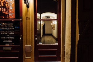 This photograph captures the inviting entrance of a building, framed by deep burgundy doors that stand illuminated against the surrounding darkness. The hallway beyond is softly lit, creating a warm and welcoming atmosphere that contrasts with the nighttime setting. The subtle details, like the vintage-style sconces and patterned floor, evoke a sense of history and charm, drawing the viewer in with a hint of mystery.
