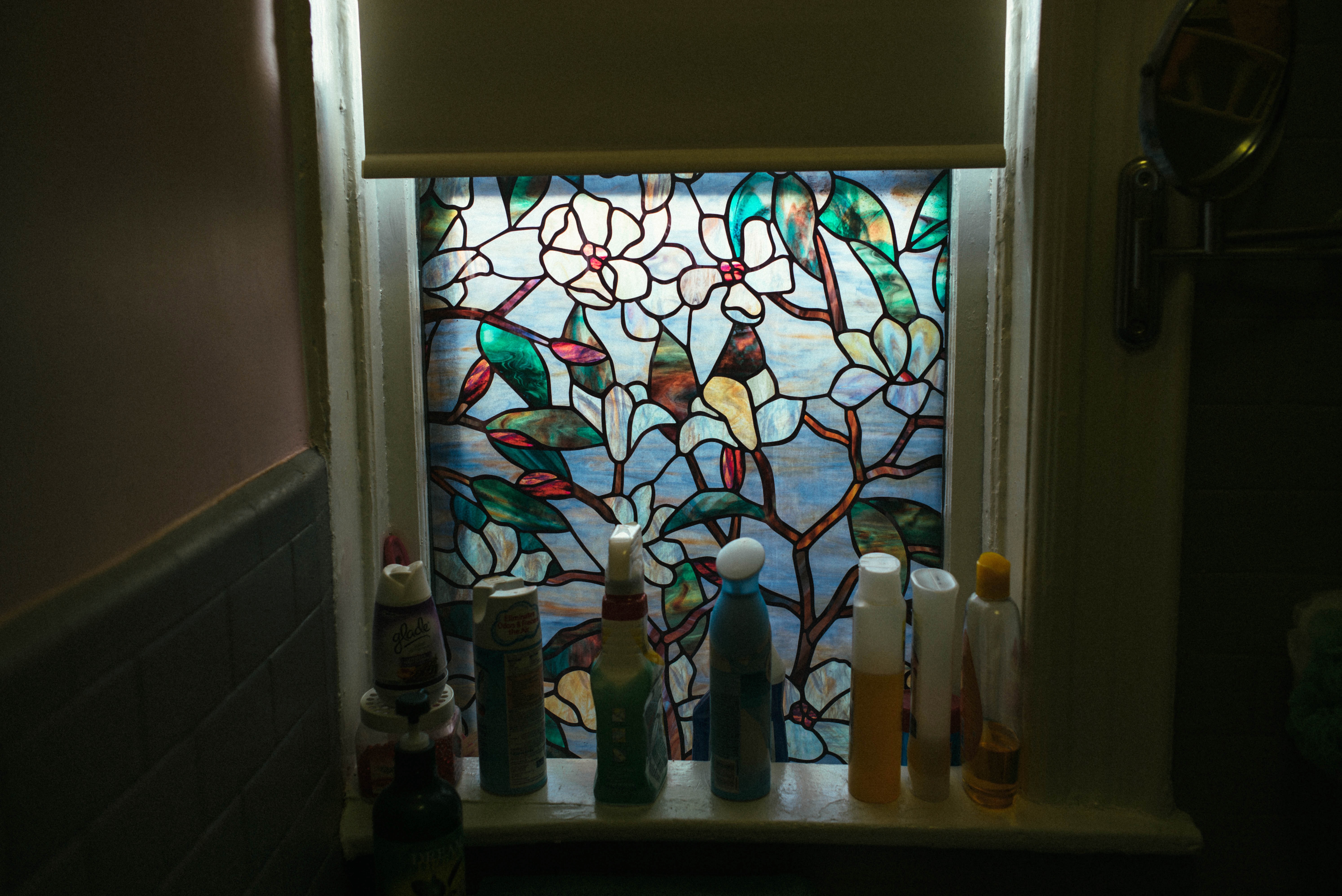 This photograph captures a vibrant stained glass window framed by an assortment of cleaning products, contrasting the elegance of the floral design against the mundane setting of a bathroom. Soft, diffused light streams through the glass, illuminating the colors and creating an intimate, almost serene atmosphere. The composition evokes a sense of quiet beauty amidst everyday tasks, highlighting the unexpected charm found in routine spaces.