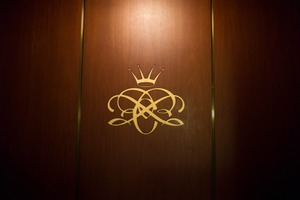 The photograph captures a sleek wooden door featuring an ornate gold emblem, which evokes a sense of sophistication and luxury. Soft lighting highlights the intricate design, casting a subtle glow that enhances the inviting yet exclusive atmosphere. The clean lines and rich tones create a harmonious composition, suggesting a space of elegance just beyond the door.