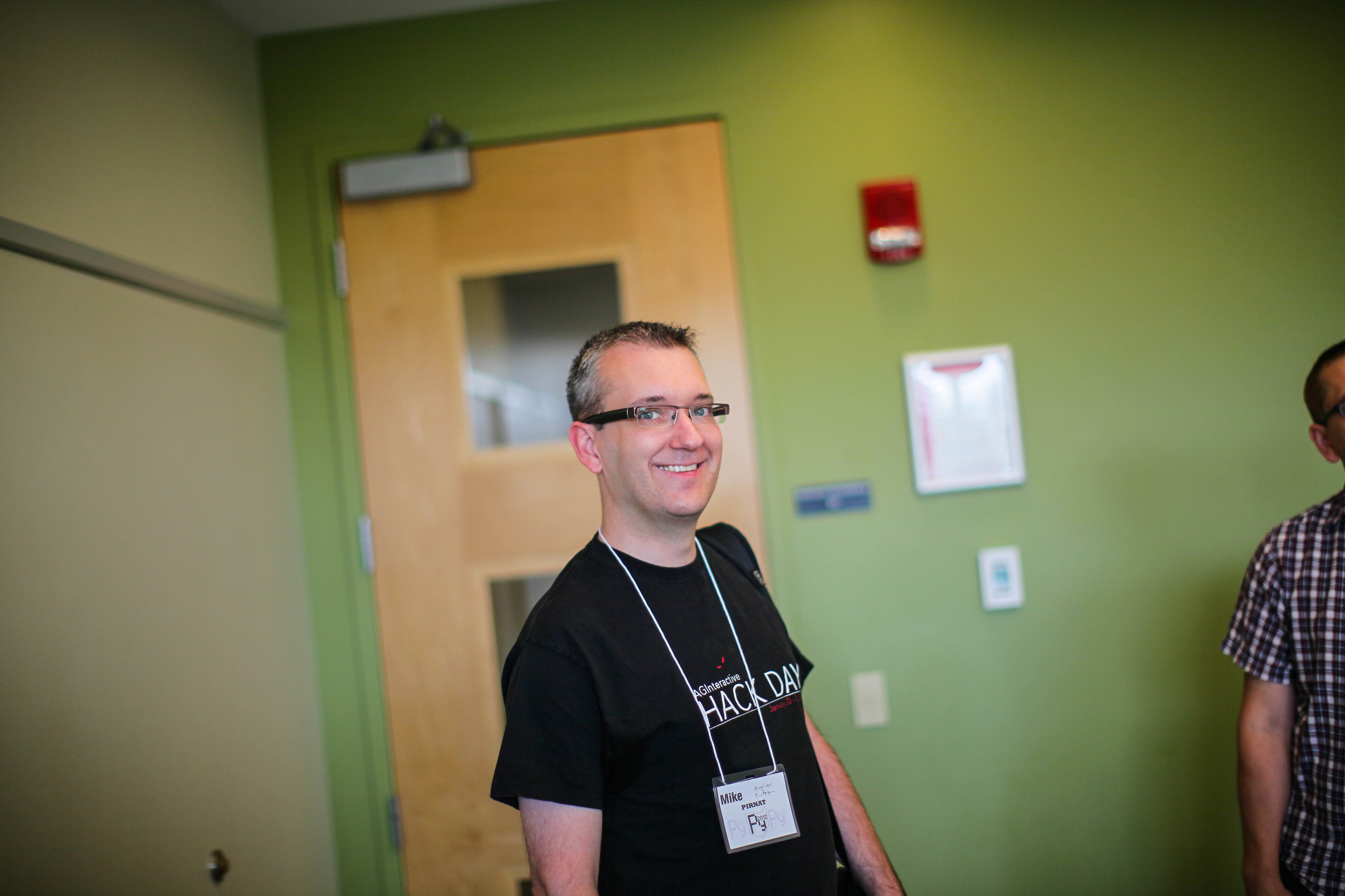 The photograph captures a cheerful individual standing in a room marked by a warm green backdrop. The soft lighting illuminates his friendly smile, creating an inviting atmosphere, while the blurred figures in the background hint at a lively gathering. The composition focuses on his genuine expression, encapsulating the spirit of camaraderie and engagement at an event.