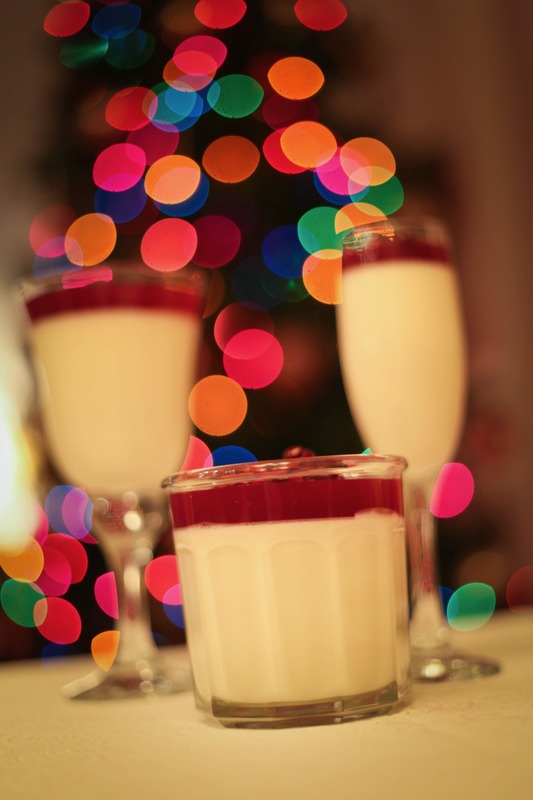 The photograph captures a trio of elegant desserts set against a dazzling blur of colorful Christmas lights, creating a magical holiday atmosphere. The creamy panna cotta topped with vibrant red jelly invites indulgence, while the soft bokeh adds a whimsical, dreamy quality to the scene. The warm, soft lighting enhances the festive mood, making the sweets the enchanting focal point of the composition.