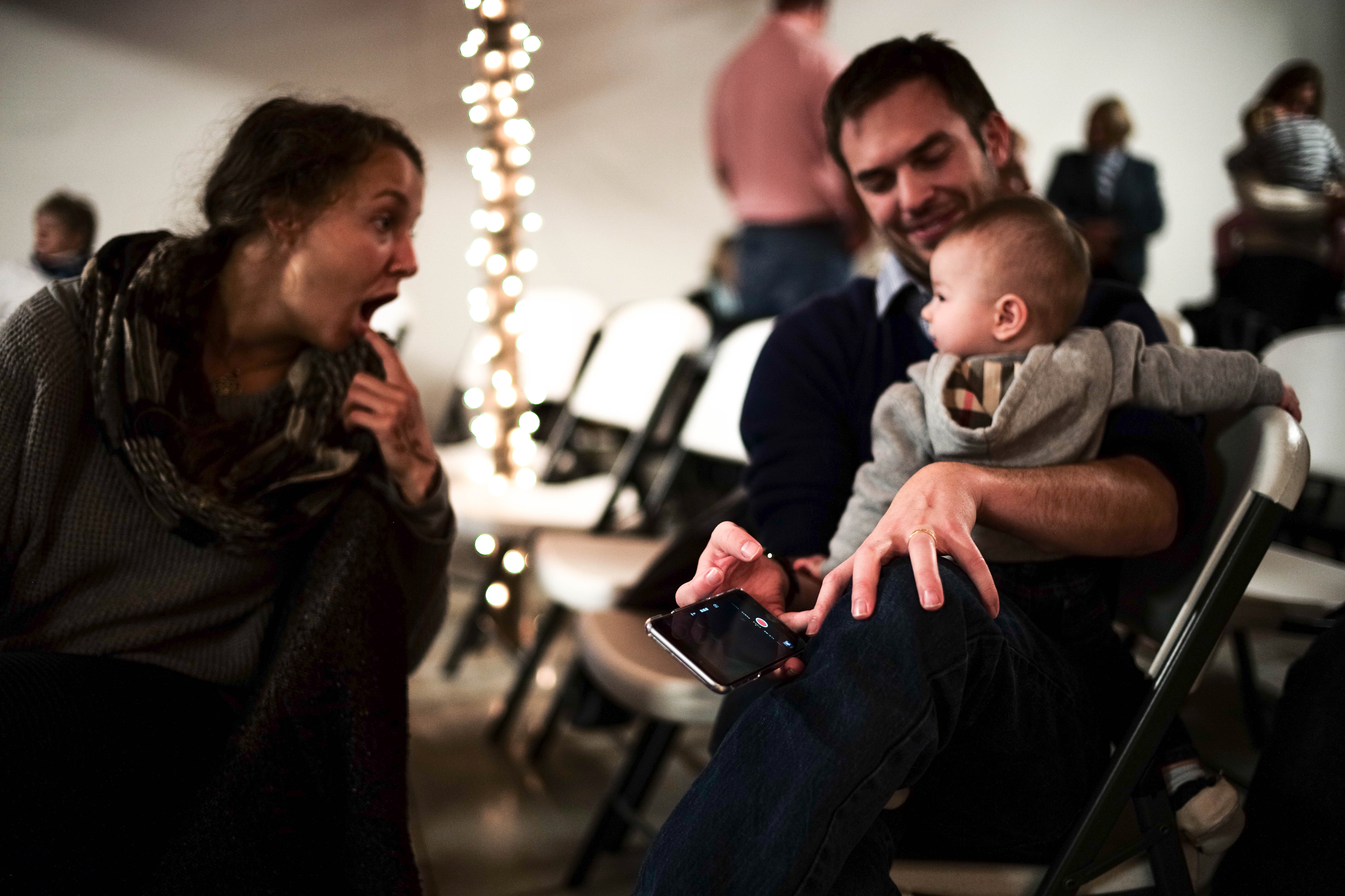 In a cozy, warmly lit atmosphere, a woman reacts in surprise while a man sits with a baby, showing them something on a smartphone. The playful interaction captures a moment of joy and curiosity, highlighting familial bonds in a casual setting. Soft lighting and blurred backgrounds create an intimate mood, emphasizing the emotions shared among the trio.