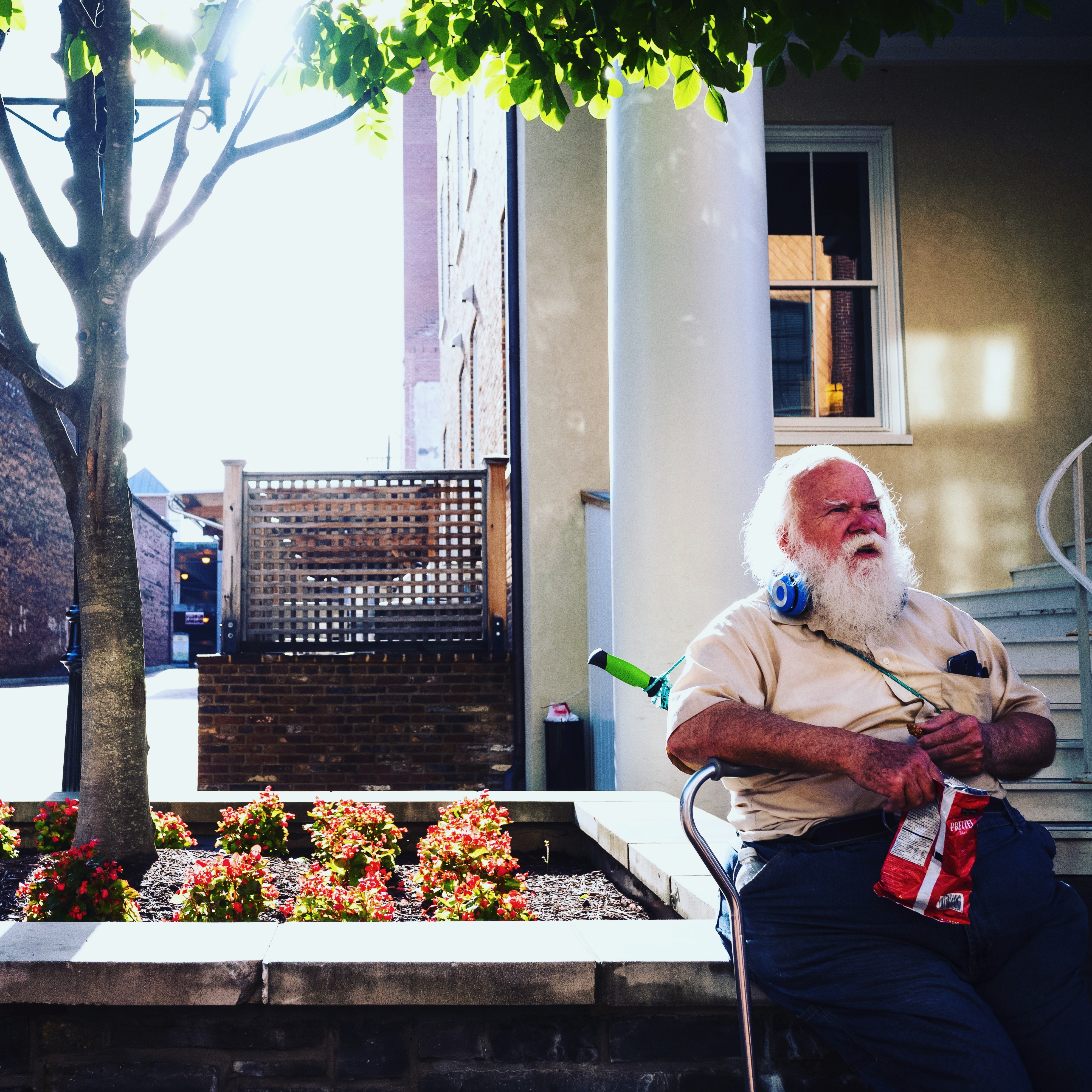 In this evocative scene, an elderly man with a thick white beard sits contemplatively on a chair, surrounded by vibrant flowers and dappled sunlight. The interplay of shadows and soft light creates a serene atmosphere, enhancing the mood of quiet introspection. His expression, combined with casual attire and headphones, suggests a moment of peaceful solitude in a bustling environment.