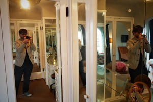 This photograph captures a man taking a selfie amidst an array of mirrors, creating a fragmented reflection of his image. The room is filled with warm, ambient light that enhances the cozy atmosphere, while the muted colors of the furnishings evoke a sense of intimacy and nostalgia. The composition draws attention to the play of reflections, emphasizing themes of self-perception and the complexity of identity.