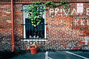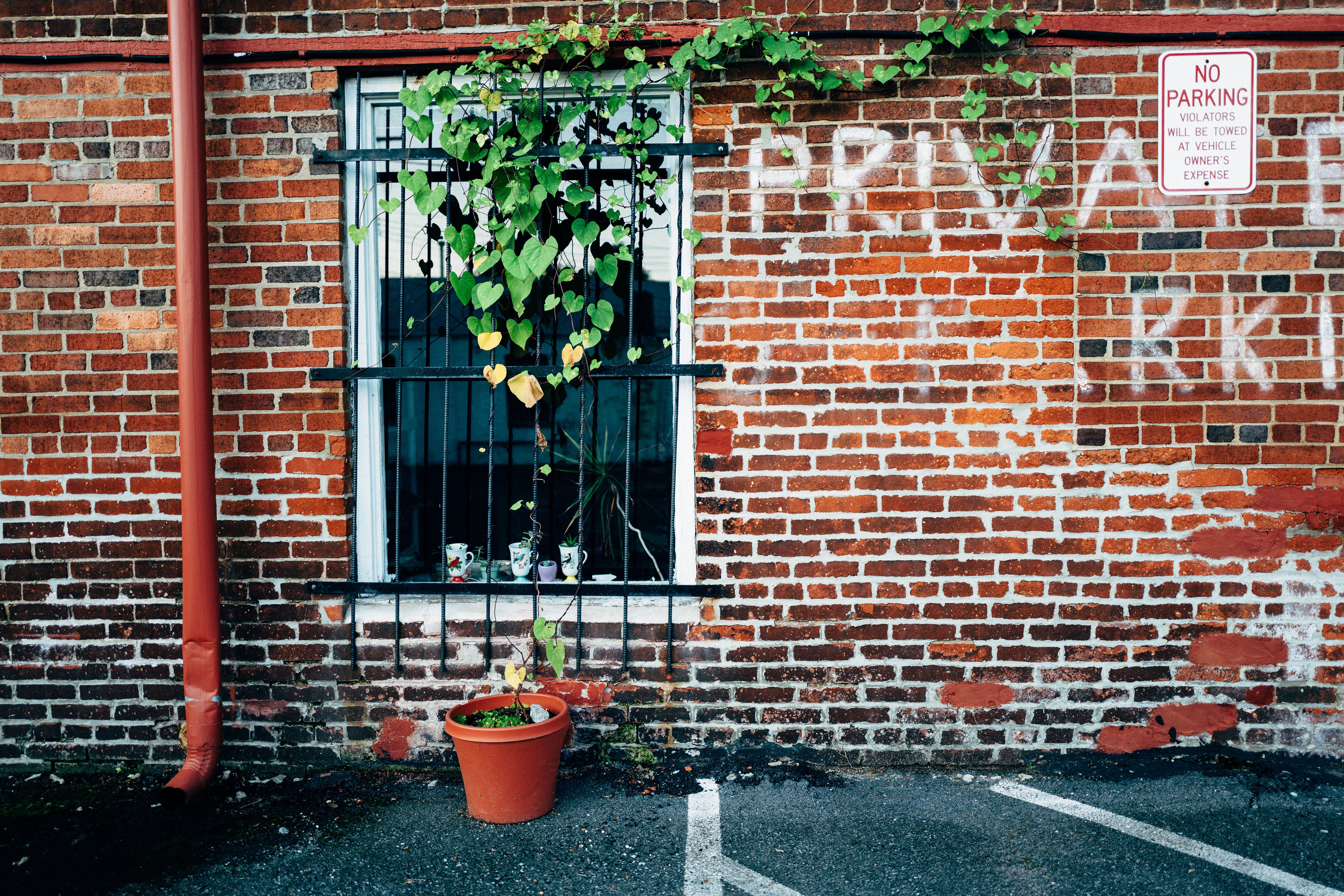 This photograph captures a solitary window framed by vibrant green vines cascading down an old brick wall, creating a sense of quiet resilience. The contrast of the lively plants against the rugged texture of the bricks evokes a mood of nostalgia and hidden stories. Soft natural light bathes the scene, enhancing the rich colors and details, while a parking sign in the corner subtly hints at the urban environment surrounding this secluded spot.