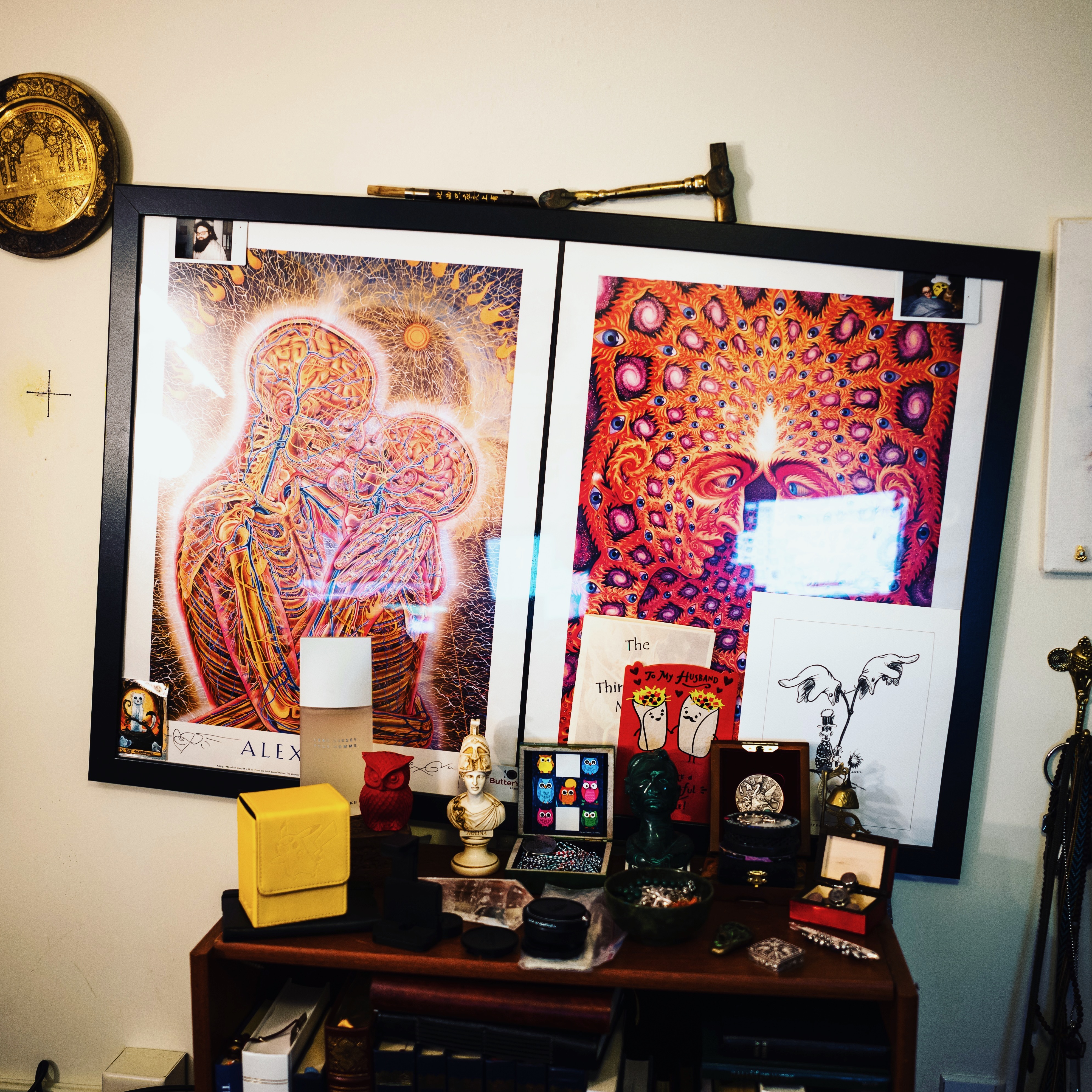 Bathed in soft natural light, this photograph showcases a vibrant collection of framed artworks juxtaposed with an array of artifacts on a wooden surface. The mood is contemplative, as the intricate patterns and colors of the artwork invite deeper reflection, while the assortment of objects adds a personal touch of nostalgia and whimsy. The overall composition creates a harmonious blend of creativity and personal history, inviting viewers to explore the layers of meaning behind each piece.