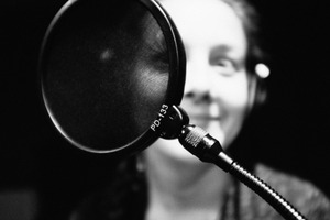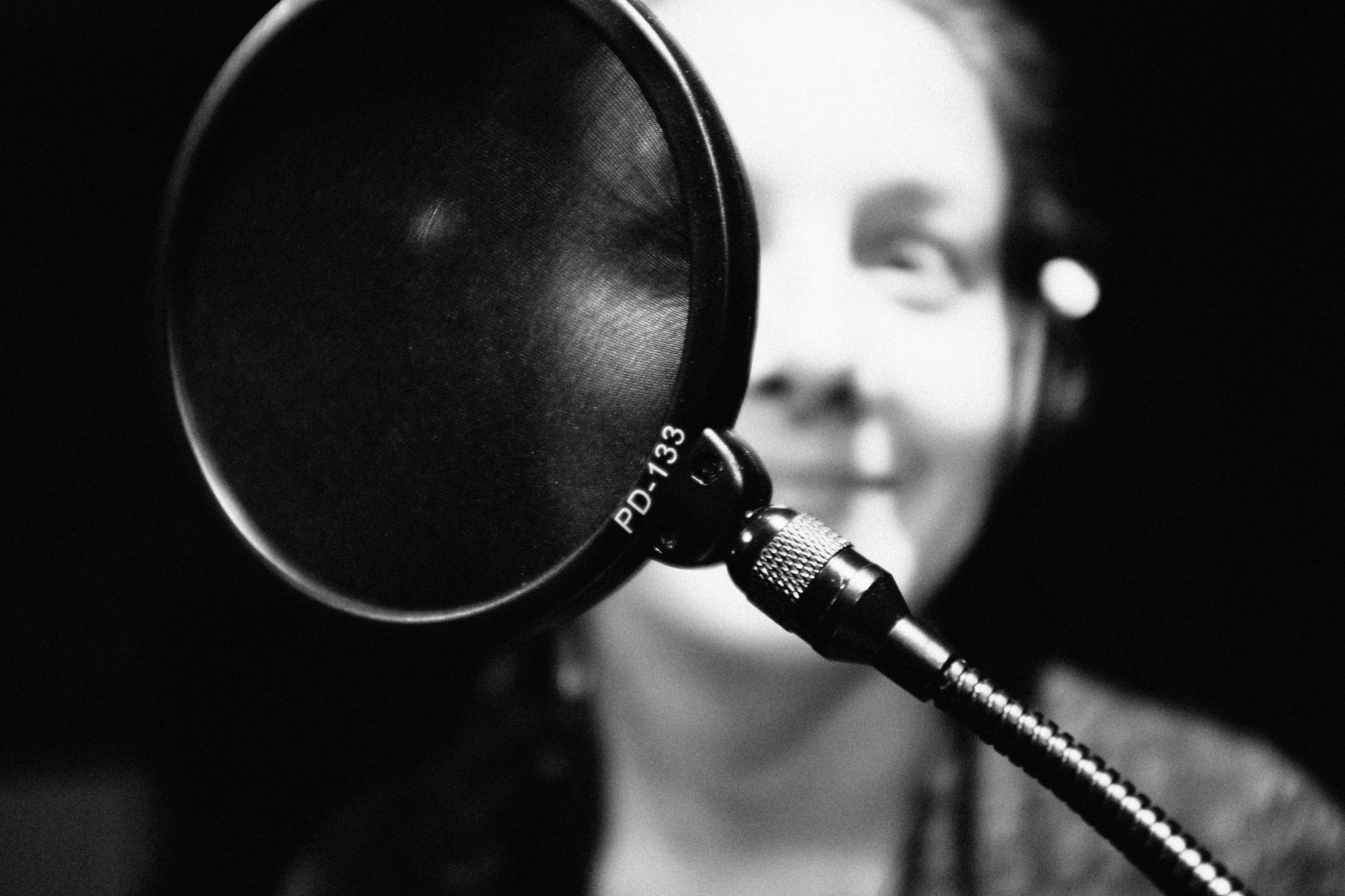 A sense of intimacy pervades this monochrome photograph, where a microphone screen obscures part of a woman's face, hinting at a moment of vulnerability. The soft, low lighting casts gentle shadows, enhancing the mystery and focus on her serene expression. This juxtaposition of light and dark creates a contemplative mood, inviting viewers to ponder the stories being shared behind the mic.