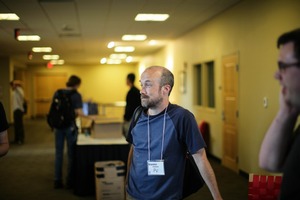 In a softly lit corridor, a man with a contemplative expression stands slightly apart from a small group, exuding a sense of introspection. His casual attire and name badge contrast with the more informal atmosphere around him, where others engage in animated discussions. The overall mood is one of quiet reflection amidst the bustle, highlighting the juxtaposition between solitude and social interaction.