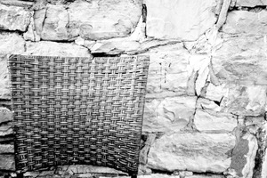 A woven chair partially emerges against a textured stone wall, creating a striking juxtaposition of materials. The black-and-white composition emphasizes the intricate patterns of the chair and the roughness of the stones, evoking a sense of quiet solitude. Soft, diffused lighting enhances the mood, making the scene feel both intimate and timeless.
