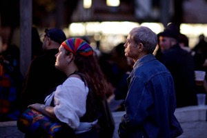 In a vibrant outdoor setting, a young woman in a colorful headband and a middle-aged man in a denim jacket stand side by side, gazing towards an unseen spectacle. The soft, atmospheric lighting casts gentle shadows, creating a contemplative mood amidst the bustling crowd. Their contrasting styles hint at a shared moment of appreciation, bridging different generations through the experience.
