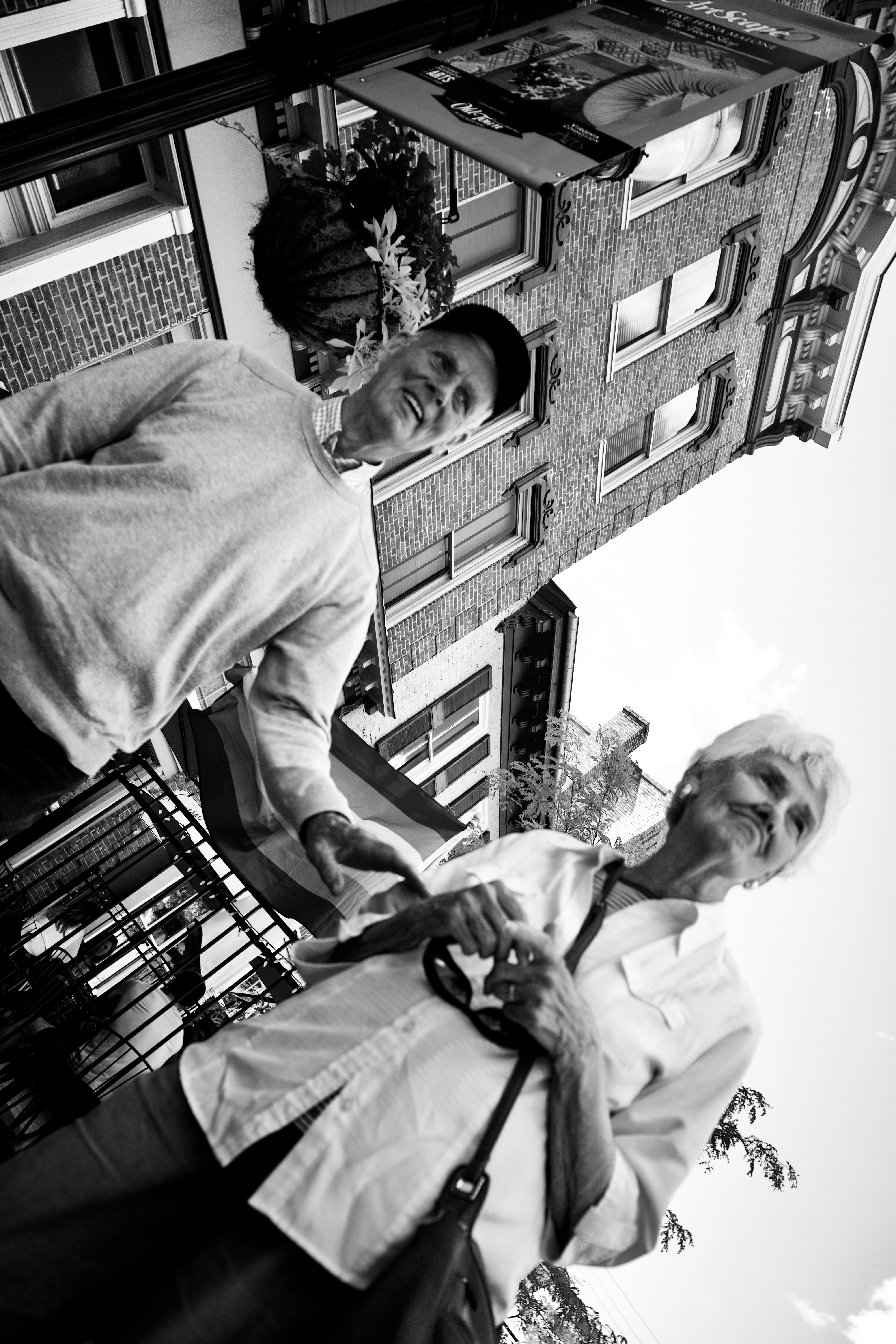 A charming moment unfolds as an elderly couple strolls hand in hand, exuding warmth and familiarity. The black and white composition enhances the nostalgic feel, while the upward angle captures the details of the historic architecture above. Soft shadows play across their faces, evoking a sense of shared stories and cherished memories.