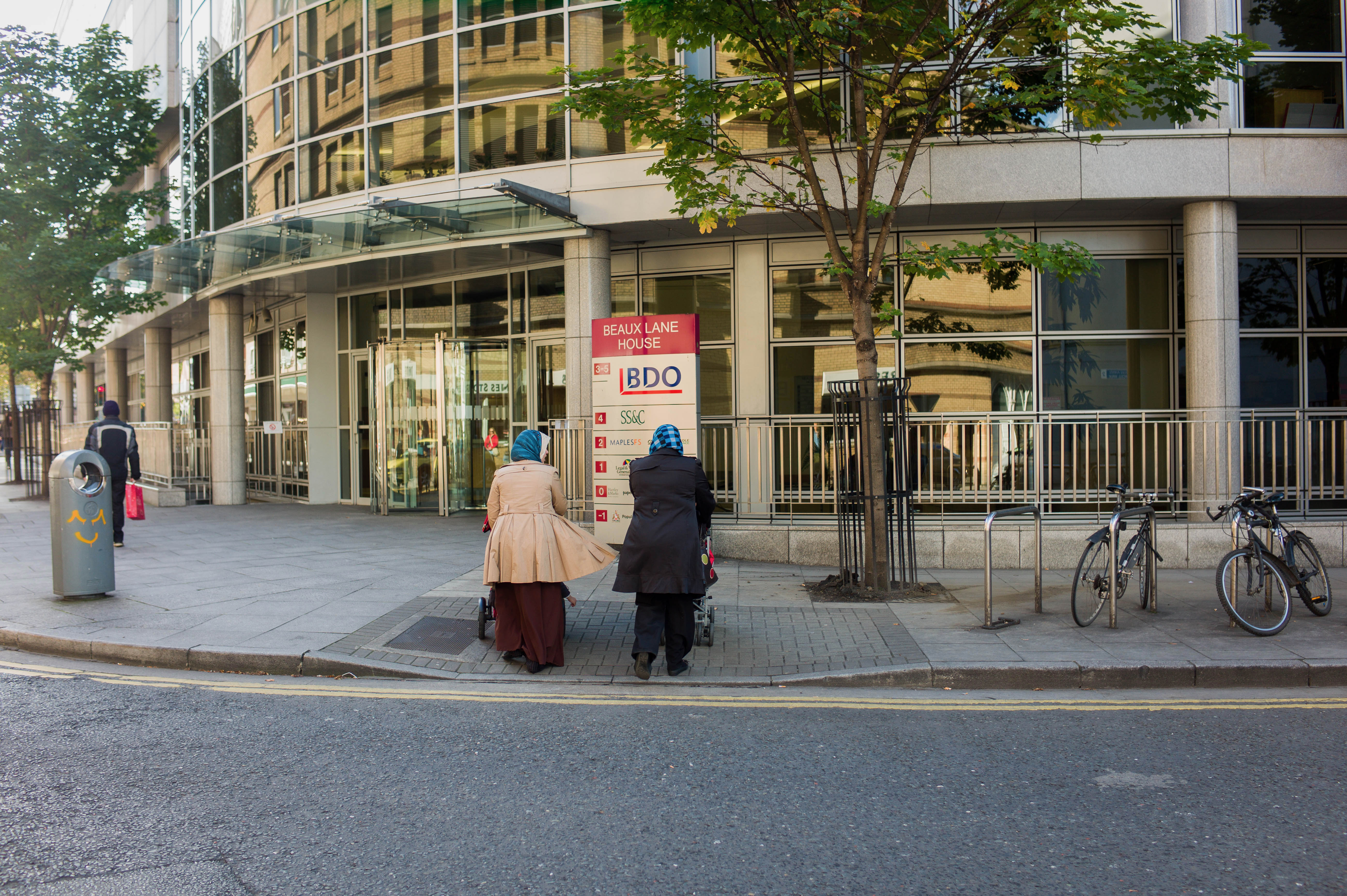 Two women, clad in flowing garments and headscarves, pause at the entrance of a modern building, seemingly engaged in conversation. The warm, inviting light of the morning casts soft shadows, enhancing the sense of tranquility in the urban environment. Nearby, the bustling street is dotted with pedestrians and bicycles, juxtaposing the serene moment shared between the women.