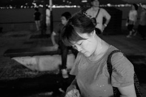 In this intimate black-and-white photograph, a woman gazes downward, lost in thought, with an air of quiet introspection. The shallow depth of field highlights her serene expression, while softly lit surroundings and blurred figures in the background enhance a feeling of solitude amidst the bustle. The moody lighting casts gentle shadows, adding depth to her contemplative moment against a lively yet indistinct backdrop.