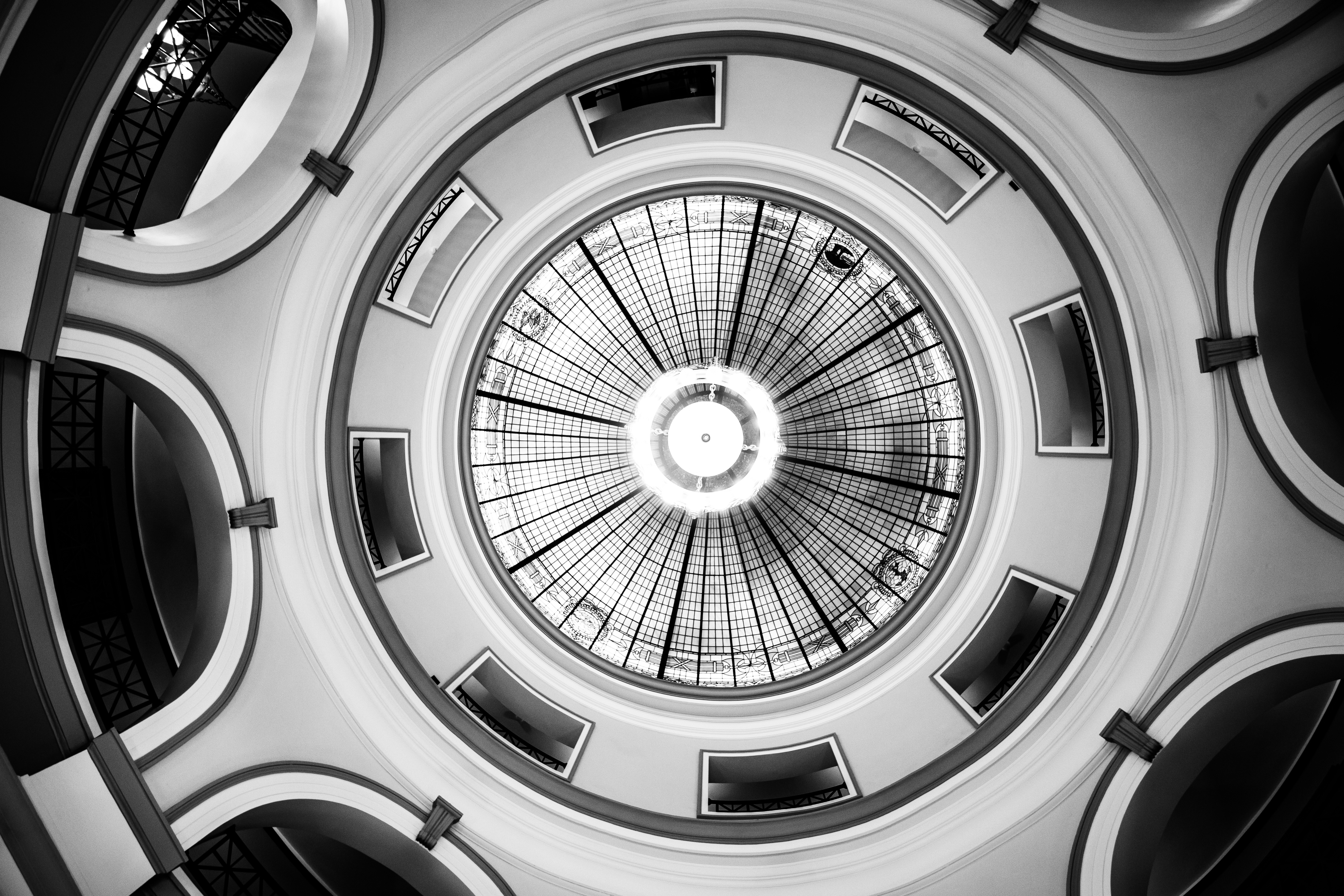 This photograph captures the intricate design of a dome from a unique upward angle, drawing the viewer's gaze toward the central skylight. The black-and-white tones enhance the architectural details, creating a sense of timeless elegance. The light filtering through the glass adds a soft, ethereal quality, evoking a sense of wonder and contemplation.