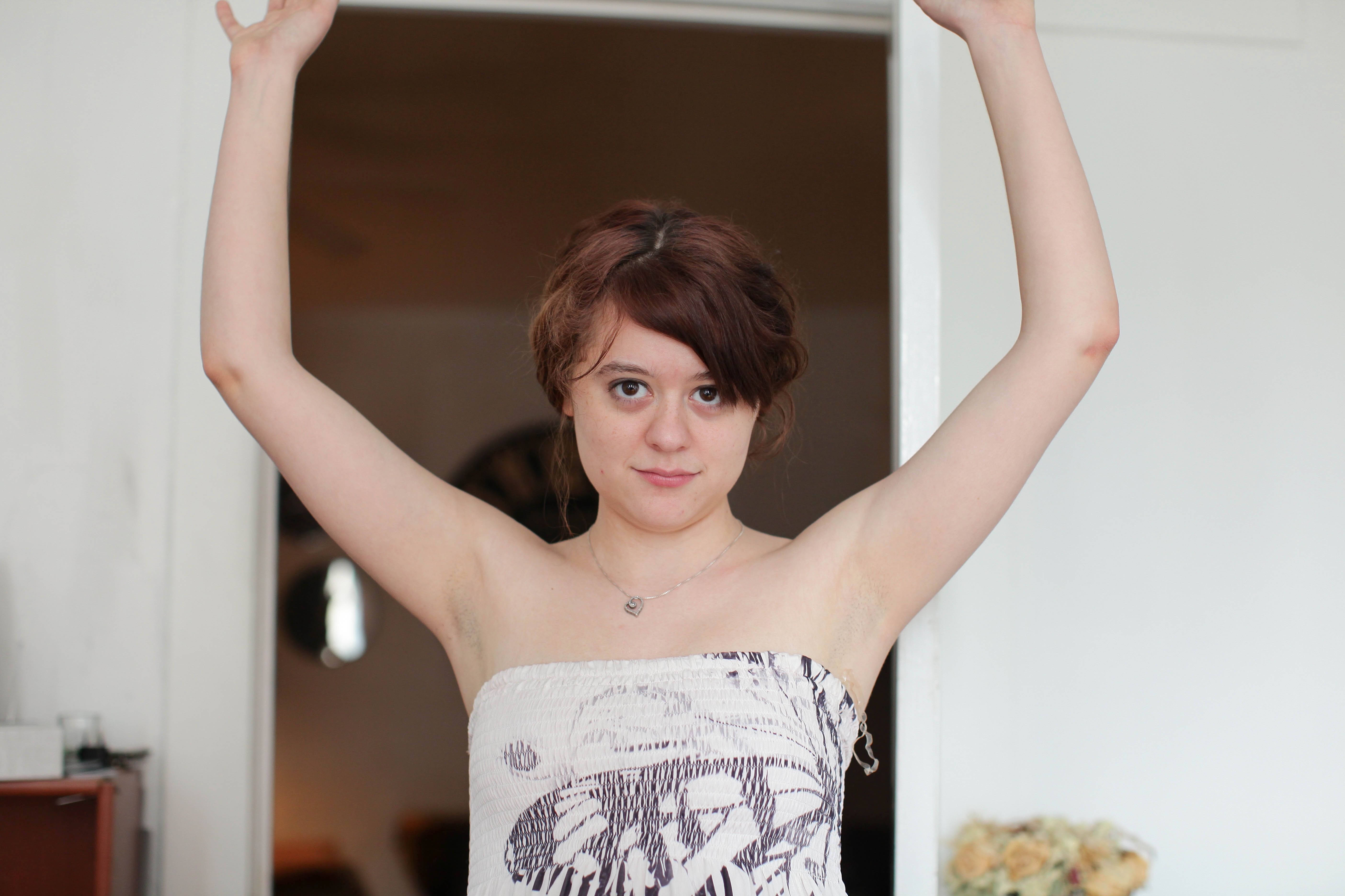 The photograph captures a young woman with her arms raised, exuding confidence in a minimalistic interior space. Soft, natural lighting enhances her delicate features and highlights the textures of her outfit, creating an intimate, contemplative atmosphere. The neutral background draws attention to her expression, which balances strength and vulnerability in a moment of self-assurance.