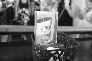In a cozy café setting, a playful retro notebook featuring a smiling woman in a bikini captures the essence of sunny beach days. The black-and-white palette adds a nostalgic feeling, while soft lighting gently highlights the details of the notebook and surrounding space. Blurred figures in the background contribute to the lively mood, suggesting a social gathering filled with shared moments.