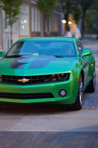 A striking green Chevrolet Camaro stands prominently on a quiet city street, its sleek lines catching the evening light. The vibrant color contrasts beautifully with the soft, muted tones of the background, creating a dynamic and bold focal point. The warm glow of street lamps hints at a serene atmosphere, suggesting a moment of calm in an otherwise bustling environment.