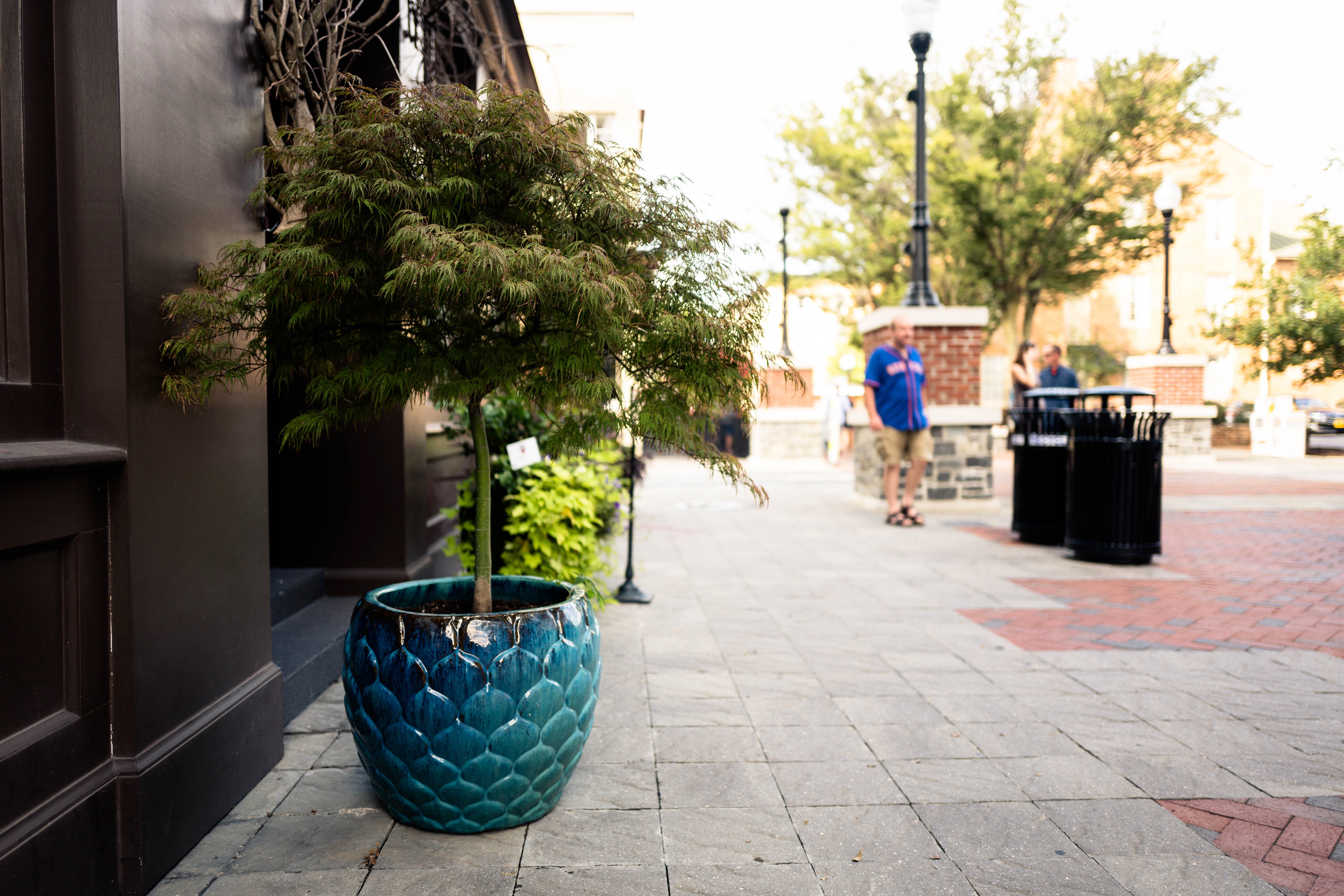 A vibrant teal pot cradles a lush green tree along a cobblestone path, drawing attention to its vivid color against the muted tones of the surrounding architecture. The soft afternoon light bathes the scene, creating gentle shadows and a warm atmosphere, while passersby engage in casual conversation in the background. This juxtaposition of nature and urban life exudes a sense of calm amidst the hustle of city living.