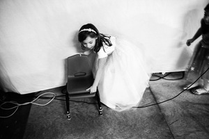 A young girl in a white, sparkly dress bends down to lift a small chair, her hair adorned with a delicate headband. The monochromatic tones and soft focus create a nostalgic atmosphere, capturing the innocence of childhood amidst the blurred movement of another child in the background. The lighting emphasizes the textures of the girl's dress, enhancing the playful yet tender mood of the scene.