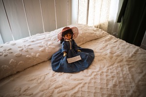 A vintage doll dressed in a blue polka-dot dress sits serenely on a white, intricately embroidered bedspread, embodying nostalgia and innocence. Soft, natural light filters through lace curtains, casting a warm glow that enhances the tranquil and slightly melancholic mood of the scene. The doll's gaze, directed towards a note resting beside it, adds an air of mystery, inviting curiosity about its story.
