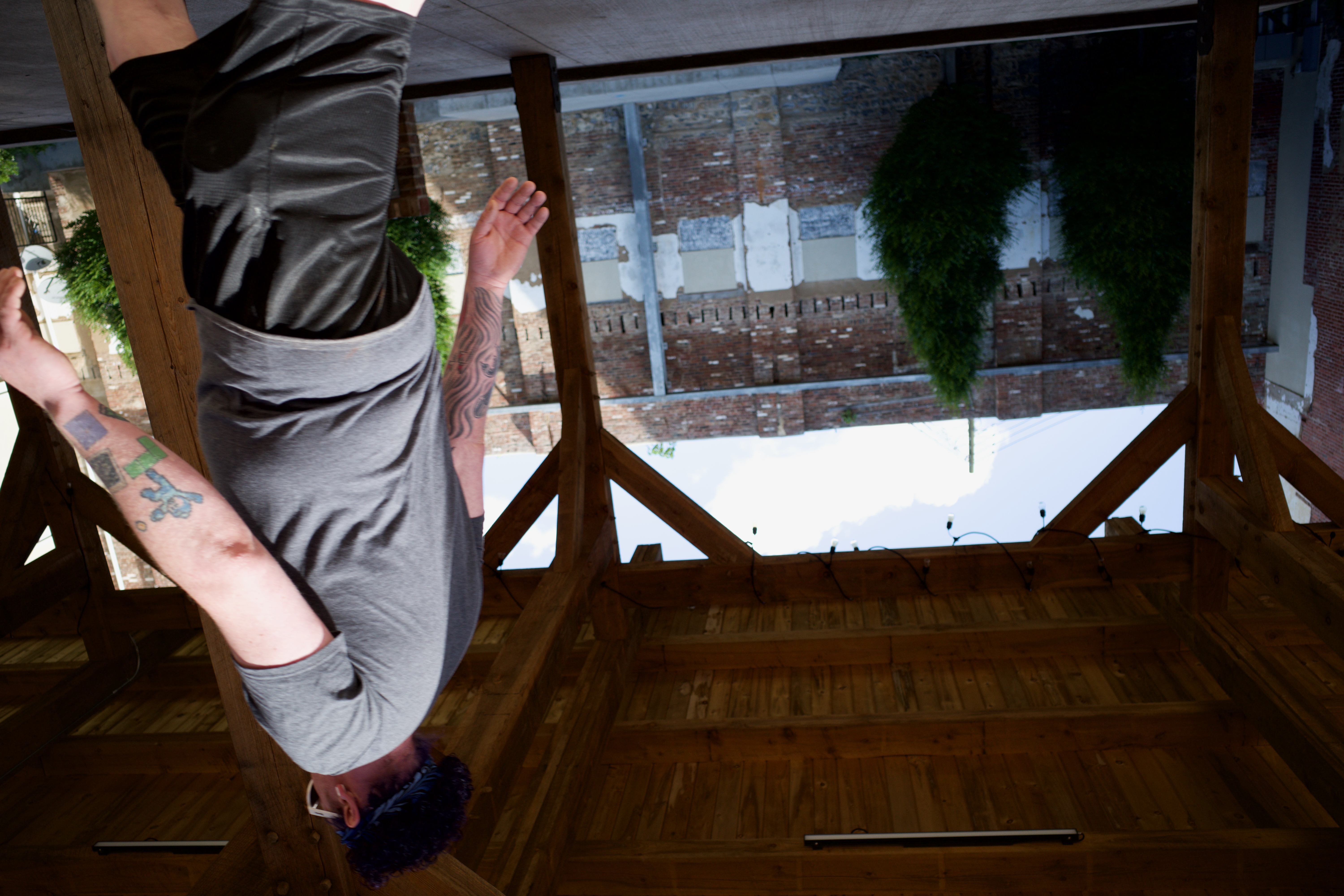 Suspended upside down, the subject embodies a moment of dynamic energy amidst the calm of rustic wooden beams. The vibrant tattoos contrast against the muted tones of the surroundings, while soft natural light filters through, enhancing the serene yet invigorating mood. The composition evokes a sense of freedom, inviting the viewer to reflect on perspectives and the juxtaposition of stillness and movement.