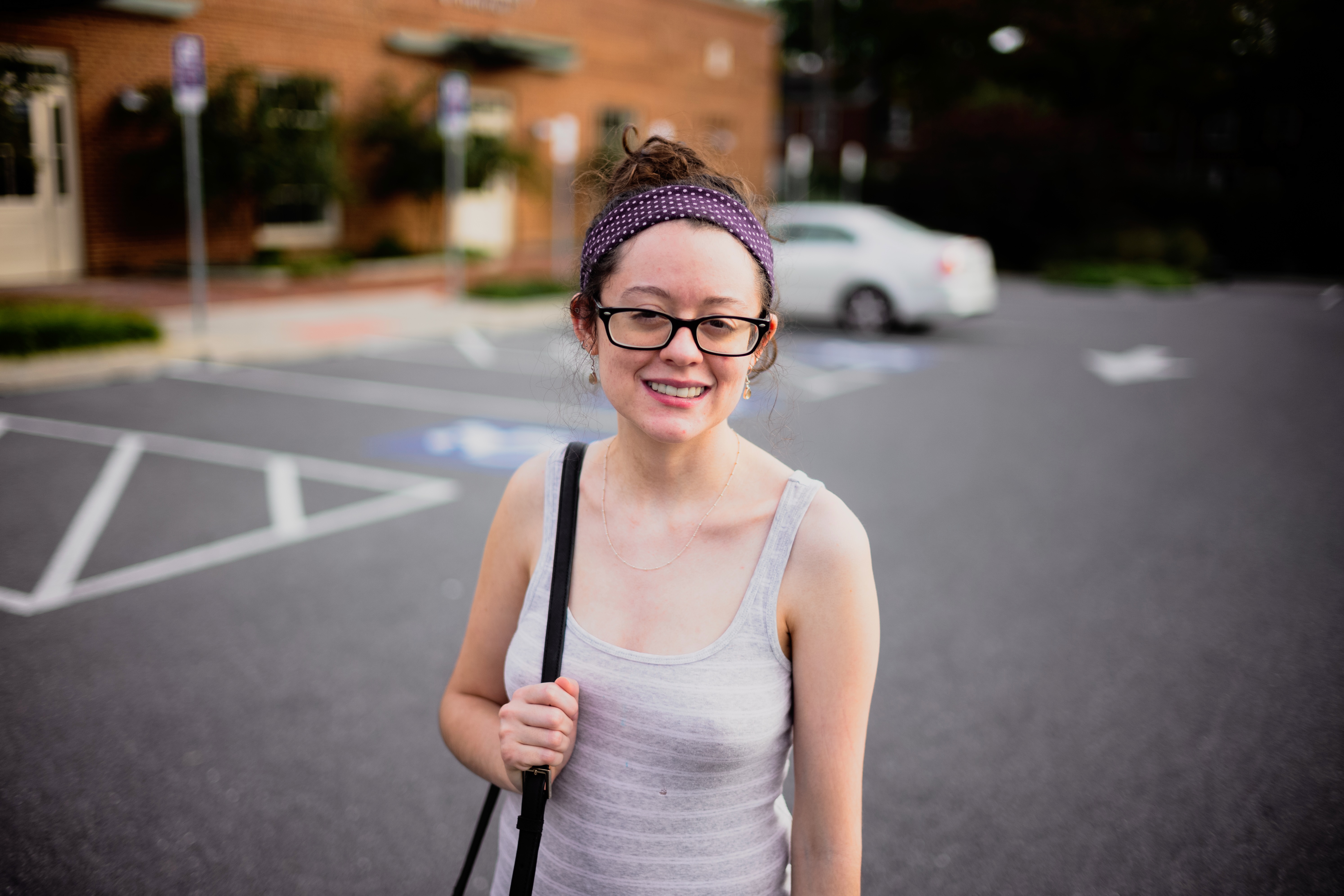 In this candid portrait, a young woman smiles warmly, embodying a sense of joy and confidence. The soft, natural lighting highlights her features against a subtly blurred urban backdrop, creating a relaxed and inviting mood. Her casual attire and subtle accessories contribute to a laid-back yet engaging composition, emphasizing a moment of connection amidst the city life.
