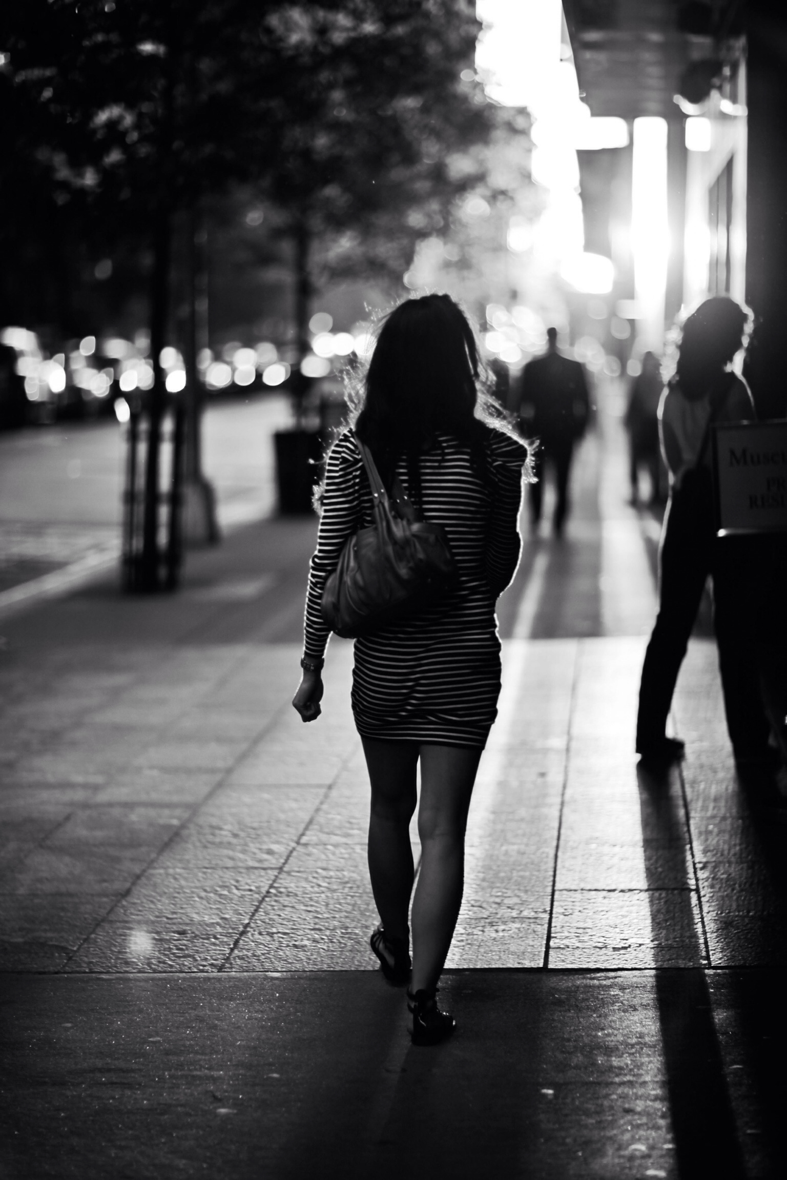 In a striking black-and-white composition, a woman in a striped dress walks away, her silhouette softly illuminated by the warm glow of the setting sun. The blurred background is filled with the hustle of city life, evoking a sense of solitude amidst the bustling urban scene. The juxtaposition of light and shadow adds a contemplative mood, inviting the viewer to reflect on the fleeting nature of moments in the city.