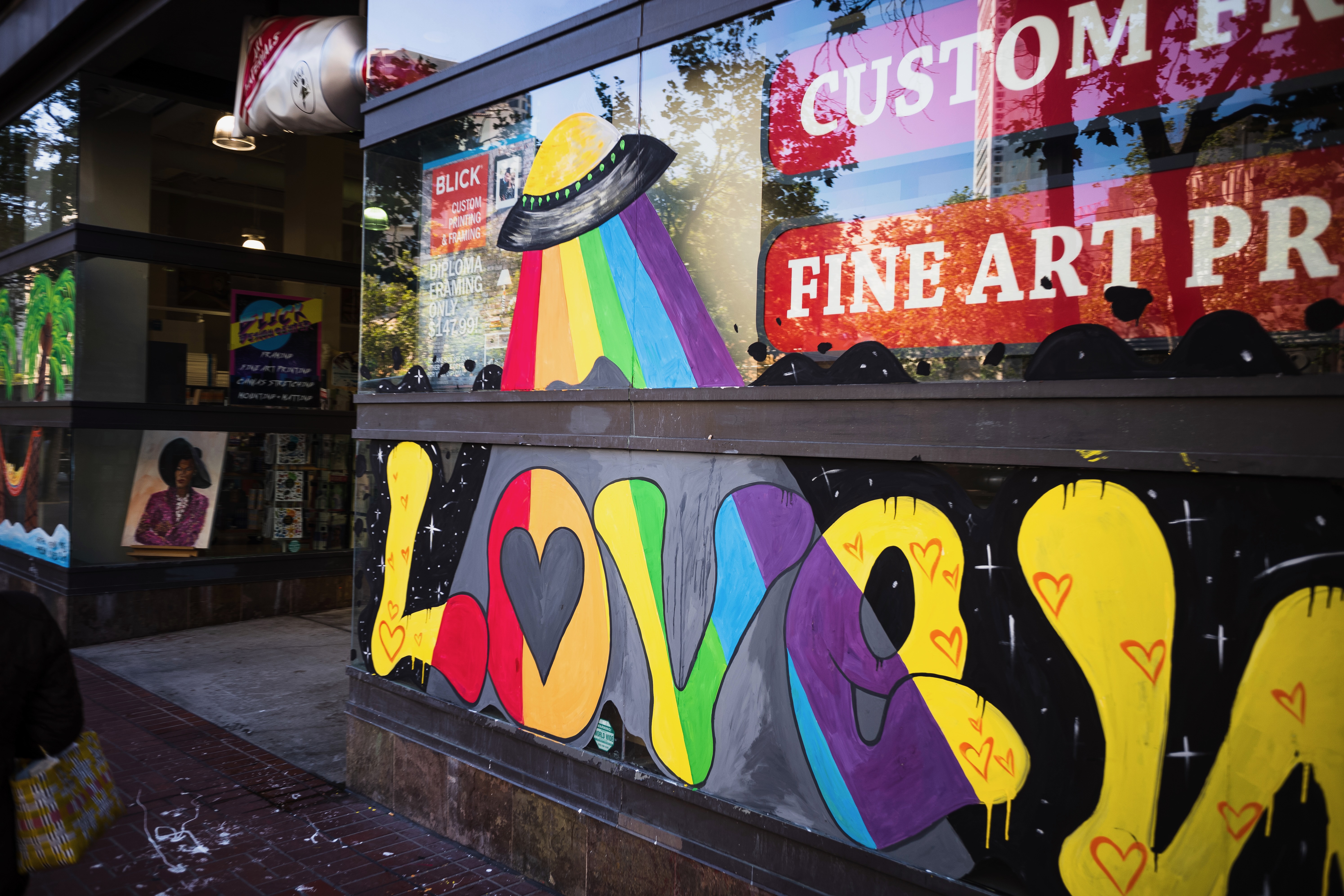 The photograph captures a lively mural on a storefront window, showcasing colorful art that blends whimsical imagery of a UFO with a bold declaration of 'LOVE'. The bright hues and playful design create an inviting and cheerful atmosphere, reflecting a sense of community and positivity. The lighting and reflections enhance the vibrancy, allowing the artwork to stand out against the urban backdrop.