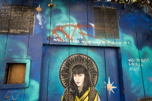 This photograph captures a vibrant mural depicting a young woman surrounded by striking colors and intricate patterns at the heart of a street art scene. Graffiti slogans intersperse the artwork, giving voice to social commentary and evoking a sense of urgency and rebellion. The lighting is soft yet illuminating, enhancing the layers of meaning embedded in the visual textures and words.