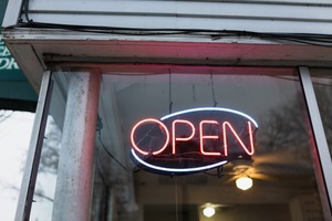 In this photograph, a glowing neon 'OPEN' sign hangs in the window, inviting passersby into a warm environment. The soft lighting contrasts with the muted exterior, creating a sense of warmth and accessibility. The close-up composition emphasizes the sign's vibrant colors, making it a focal point in an otherwise quiet street scene.