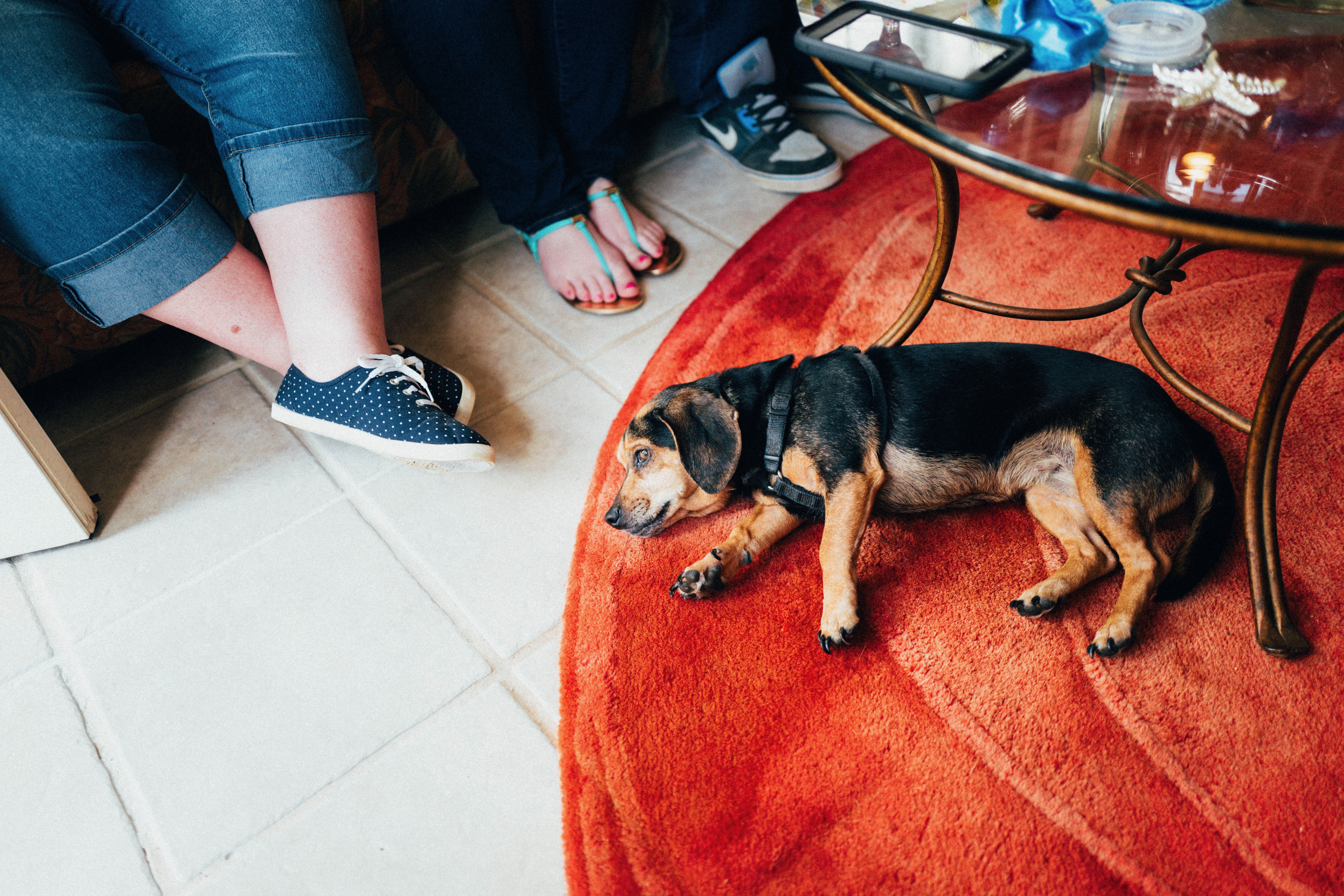 In a warm and inviting living room, a sleepy dog lies contentedly on a bright orange rug, surrounded by relaxed companionship. The casual attire of the seated figures hints at a comfortable, laid-back atmosphere, while soft natural light bathes the scene, enhancing the feeling of tranquility. This intimate composition captures a moment of peace and connection within a homey space.