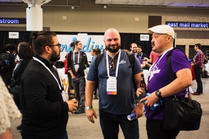 In a bustling event space, three men engage in lively conversation, their expressions animated and friendly. The soft, natural lighting casts a warm glow, enhancing the inviting atmosphere, while a backdrop of attendees adds a sense of community and shared experience.