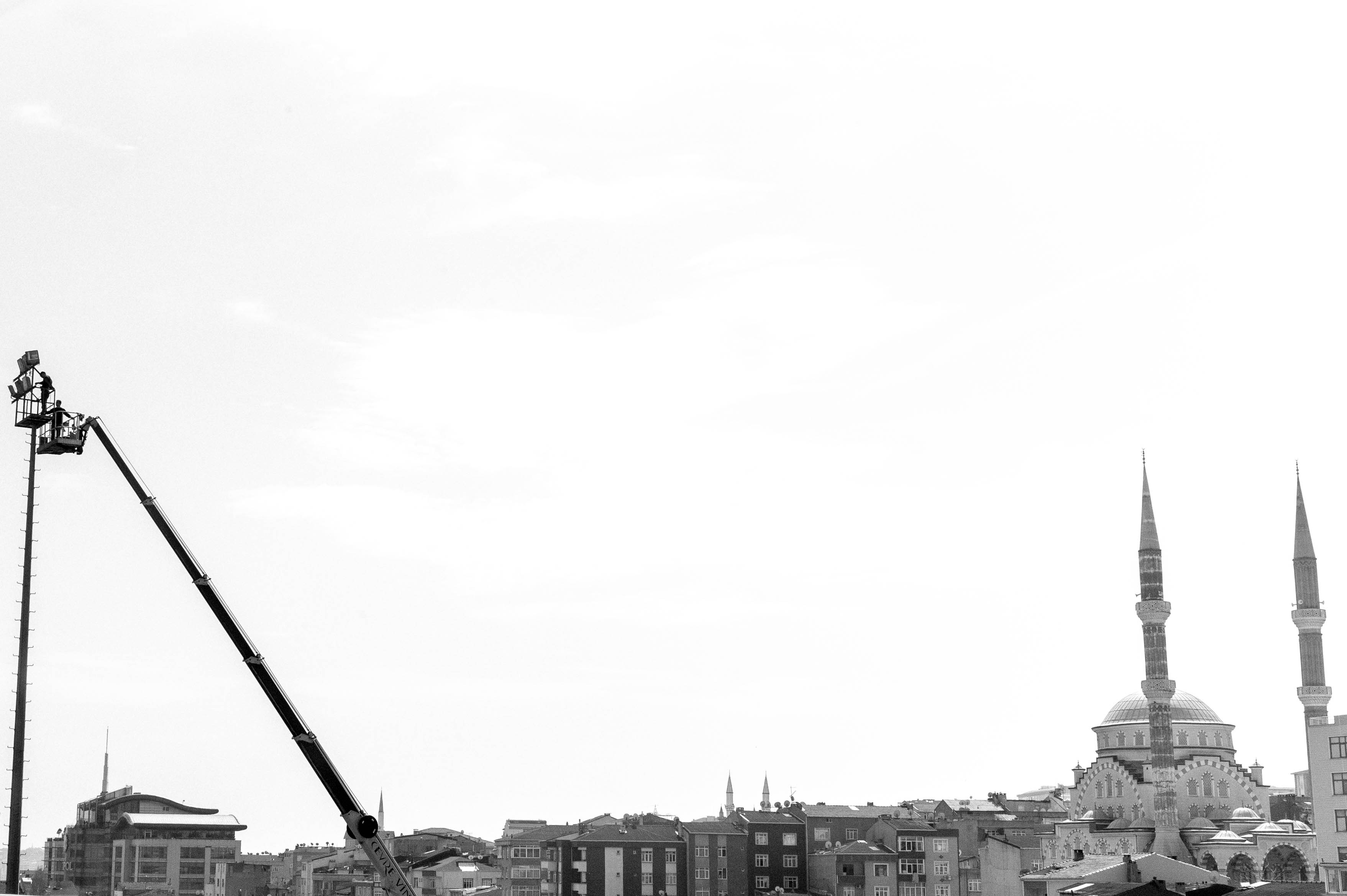 In this black and white photograph, a worker on a towering crane stands against a vast, cloudy sky, silhouetted by the architectural majesty of a distant mosque. The contrast between the modern machinery and the historic structure evokes a sense of temporal tension, while the minimalist composition enhances the feeling of isolation and stillness. The soft lighting casts gentle shadows, adding depth to the scene, capturing a moment of labor amidst the grandeur of the city.
