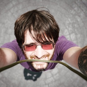 This striking photograph captures a man smiling joyfully as he looks directly into the camera from a unique overhead angle. His vibrant purple shirt contrasts with the stark, textured background, enhancing the playful mood. Bright sunlight illuminates his features, creating a sense of warmth and spontaneity in the composition.