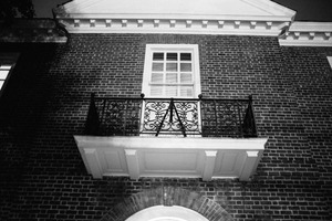 The photograph captures a striking black-and-white view of a brick facade, centering on a delicate balcony adorned with intricate wrought iron. The stark contrast between shadows and light creates a sense of mystery, with the light illuminating the window while the rest remains veiled in darkness. The composition draws the eye upward, evoking a mood of quiet contemplation and architectural beauty.