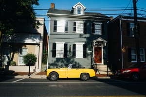 A vibrant yellow convertible stands parked against a backdrop of a stately gray house, creating a striking contrast. The strong morning light casts sharp shadows, enhancing the architectural details and lending a warm, nostalgic mood to the scene. The composition, framed by surrounding buildings and greenery, exudes a charming, leisurely vibe typical of a quaint neighborhood.