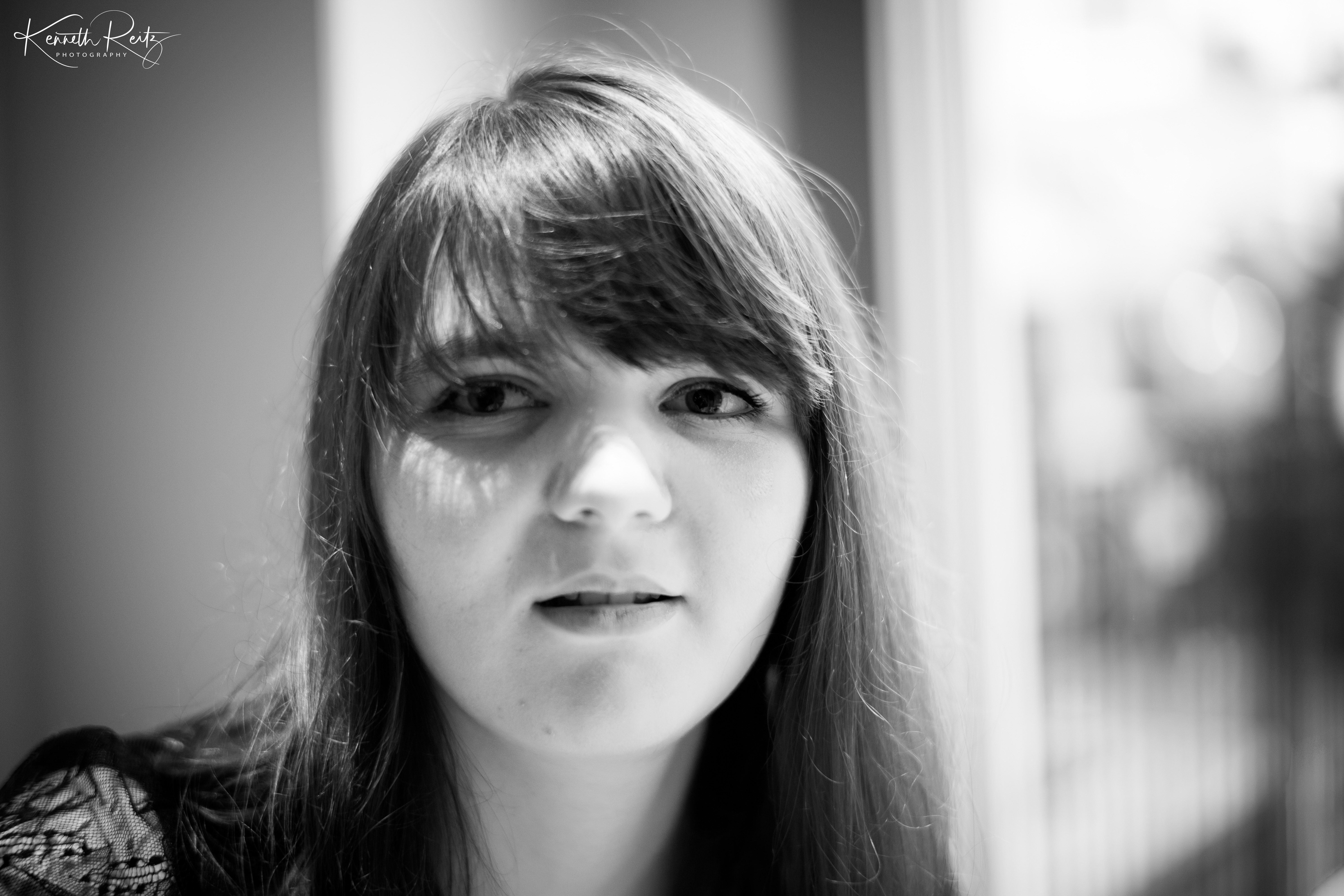 The photograph features a young woman with long, dark hair, set against a softly blurred background. The black and white tones enhance a contemplative mood, with natural light illuminating her face and creating gentle shadows. Her direct gaze invites engagement, suggesting layers of thought and emotion beneath her calm exterior.