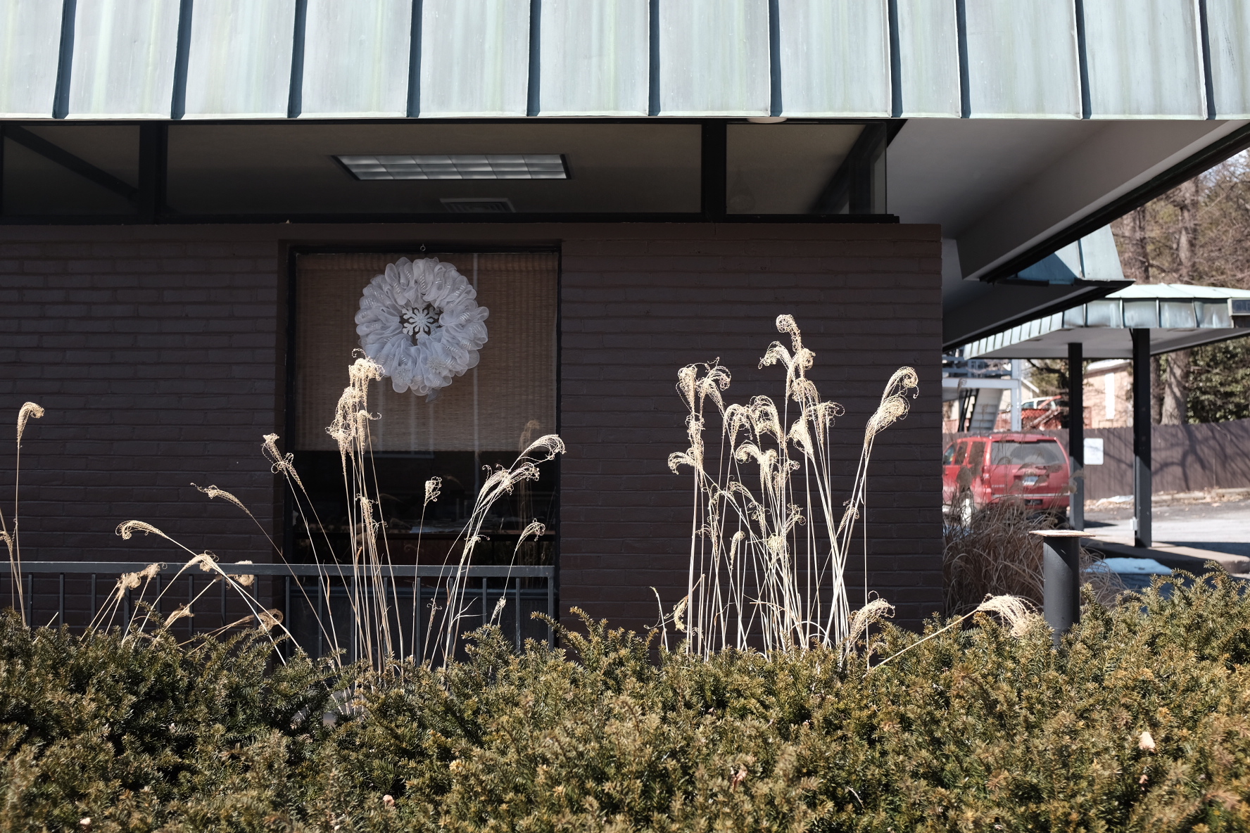 A juxtaposition of natural elements and structured design, this photograph captures dried grasses in the foreground, swaying gently against a stark architectural backdrop. The muted tones and soft shadows create a serene, almost nostalgic mood, while the wreath hanging in the window hints at warmth and life within the building. This blend of organic and geometric forms invites viewers to contemplate the harmony between nature and human construction.