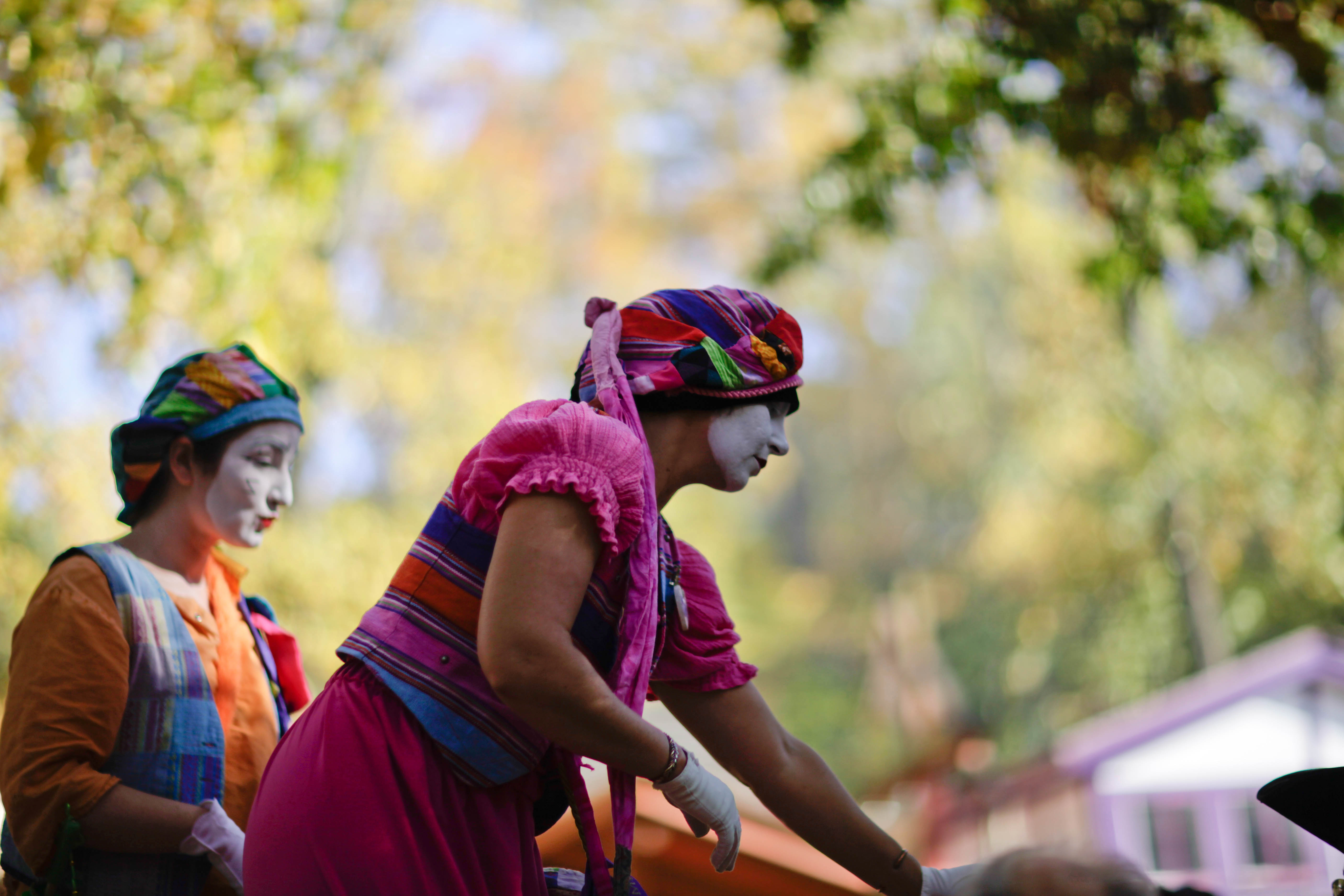 In this vibrant photograph, two clowns adorned in traditional costumes engage in their playful world under the soft, dappled sunlight filtering through the leaves. Their painted faces hint at a whimsical mood, contrasting with the serene autumn backdrop. The shallow depth of field elegantly draws attention to their expressions and elaborate attire, evoking a sense of warmth and festivity.