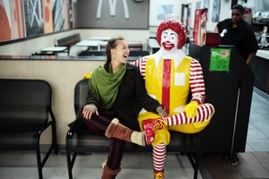In a playful moment captured at a fast-food restaurant, a woman shares a joyful laugh with a life-sized Ronald McDonald statue. The cozy, casual atmosphere is enhanced by warm lighting, which creates an inviting mood. Their carefree poses, with legs crossed and smiles wide, evoke nostalgia and whimsy amidst the everyday setting.