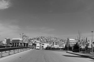 This black-and-white photograph captures a downward view of a sprawling cityscape, where buildings ascend on a distant hill. The stark contrasts of light and shadow evoke a sense of urban isolation, while the empty road draws the eye towards the elevated structures, suggesting a journey yet to unfold. The composition highlights geometric lines and forms, reinforcing the architecture's dominance over the landscape.