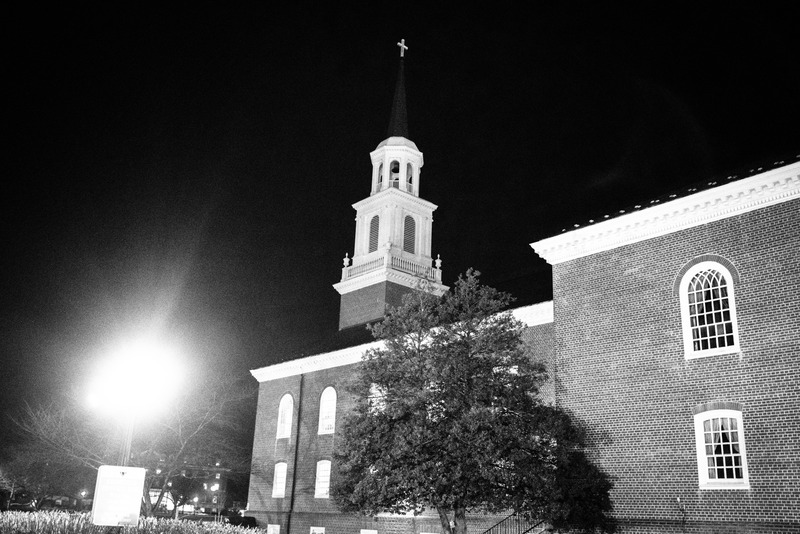 The photograph captures a church steeple reaching into the night sky, illuminated by a solitary streetlight that creates a stark contrast against the dark backdrop. The composition highlights the brick structure and its classic architecture, while the surrounding trees add a touch of life and depth. The mood is both serene and contemplative, evoking a sense of quiet reflection in the stillness of the night.