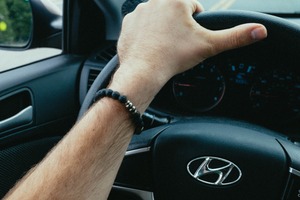 A close-up shot captures a hand gripping the steering wheel of a Hyundai, showcasing a mix of casual elegance and focus. The ambient light filters softly through the car, hinting at a journey underway while the bracelet on the wrist adds a personal touch to the scene. The composition draws attention to the act of driving, evoking a sense of adventure and liberation.