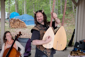 In a lively outdoor setting, a charismatic man strikes a playful pose with two unique string instruments, exuding an aura of joy and creativity. The light filtering through the trees adds a soft glow, enhancing the relaxed, celebratory mood. Nearby, a woman plays a cello, contributing to the enchanting atmosphere of this gathering among friends.