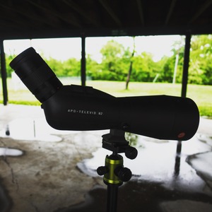 The photograph features a high-quality spotting scope, elegantly positioned on a tripod, hinting at the anticipation of outdoor observation. Surrounding the scope, a muted light filters in through the overhang, creating a reflective, moody atmosphere on the wet floor. Lush greenery is visible in the background, suggesting a serene natural setting waiting to be explored.