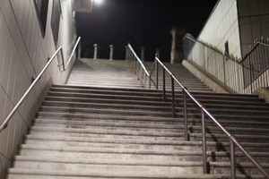 A narrow staircase ascends into the darkness, illuminated by a solitary overhead light, casting long shadows along the concrete steps. The mood is both inviting and daunting, as the viewer is drawn upwards, evoking a sense of curiosity and anticipation. The stark lines of the railing and the minimalistic surroundings create a dramatic composition, highlighting the solitude of the night.