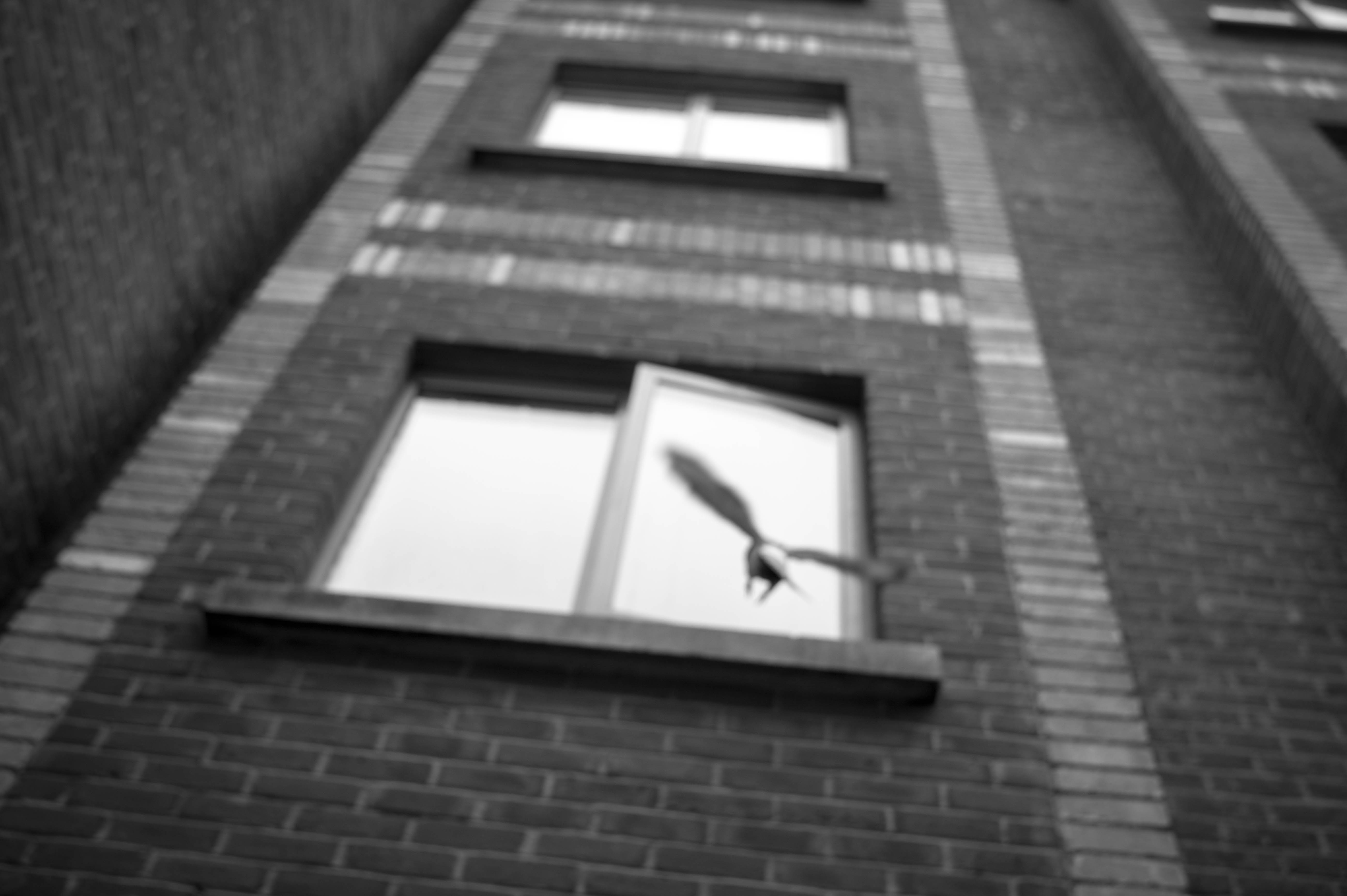 A striking black-and-white photograph captures a bird in mid-flight, darting away from an apartment window. The blurred motion adds a sense of urgency, contrasting against the solid brick facade that looms above. The subdued light furthers the mood of introspection, inviting viewers to contemplate the themes of freedom and confinement.