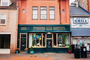 The photograph captures a quaint storefront, 'The Polka Dot Pot,' adorned with colorful flags and potted plants, exuding a welcoming charm. The warm hues of the building contrast beautifully with the vibrant displays, creating an inviting atmosphere. Soft natural light bathes the scene, enhancing the cozy, small-town feel of the street.